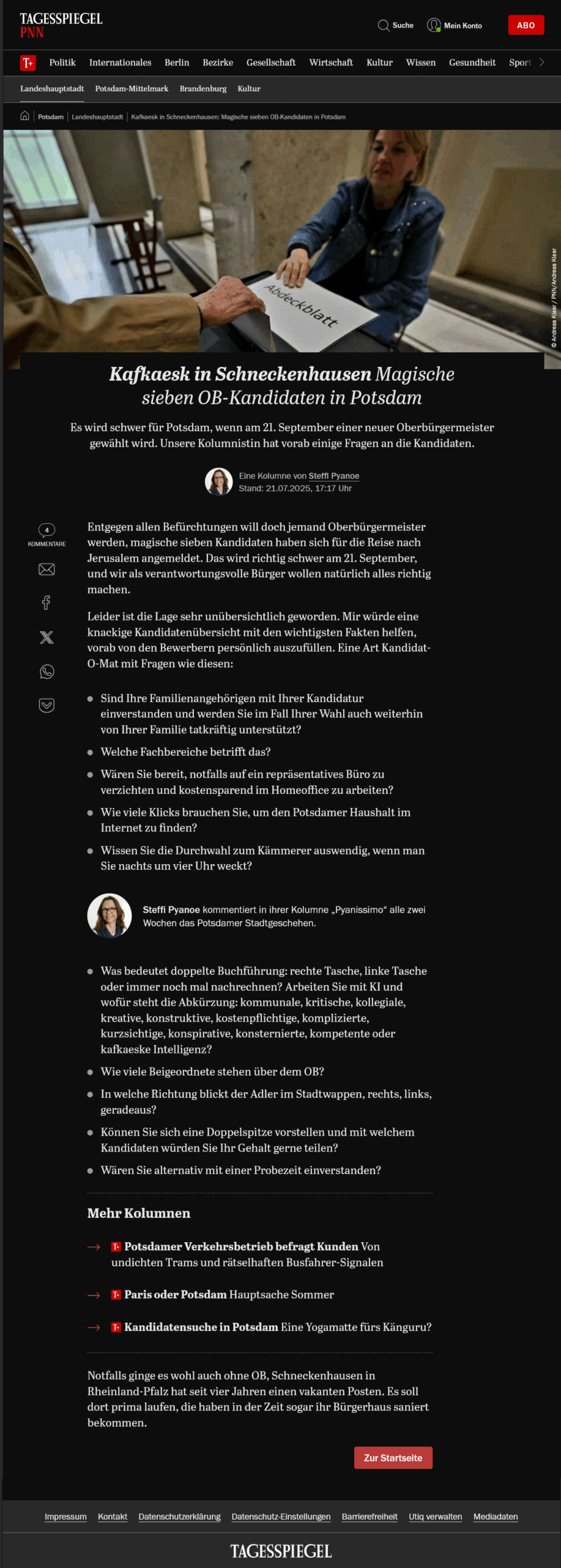 Die Potsdamer Neueste Nachrichten sind beunruhigt und besorgt! Im Kommentar „Kafkaesk in Schneckenhausen: Magische sieben OB-Kandidaten in Potsdam“ werden wichtige Fragen aufgeworfen, die die Potsdamerinnen und Potsdamer umtreiben.