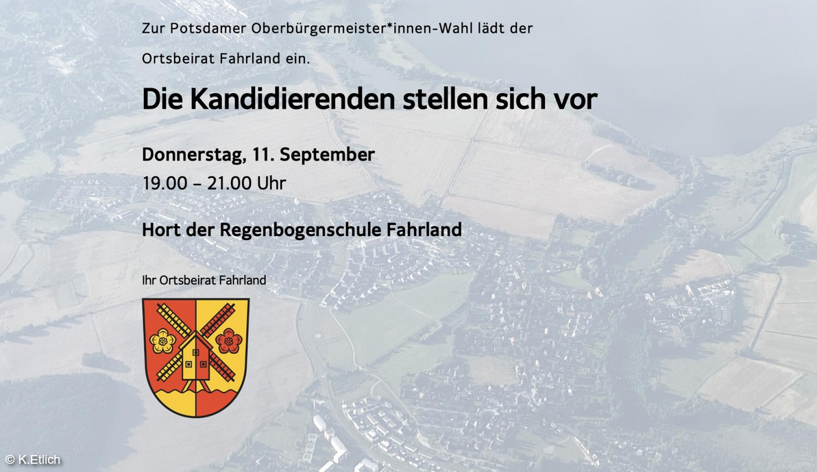 ![]() Der Ortsbeirat Fahrland gibt den BürgerInnen von Fahrland, Kartzow, Krampnitz und Satzkorn die Möglichkeit, die Kandidaten zur Oberbürgermeisterwahl kennenzulernen. 1. „Was qualifiziert genau Sie zum Potsdamer Oberbürgermeister (also unter anderem ein Unternehmen mit etwa 2000 Mitarbeitenden in der Verwaltung zu führen)?“ 2. „Was ist Ihre Vision für die Entwicklung der Potsdamer nördlichen Ortsteile, wie sehen […] |